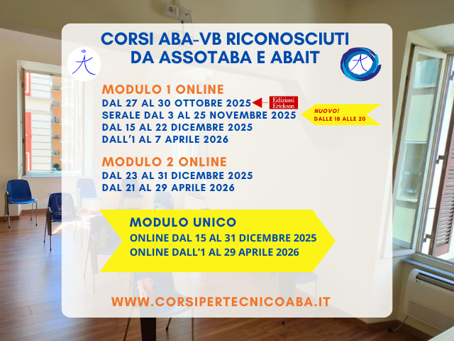 ATTENZIONE! Su sollecitazione di ABAIT stiamo rimodulando la nostra formazione per TAC Tecnico Comportamentale ABA quindi a partire da maggio 2025 al termine del MODULO 2 sarà sostenuta la prova teorica pratica e sarà attivato anche il CORSO ABA MODULO UNICO.